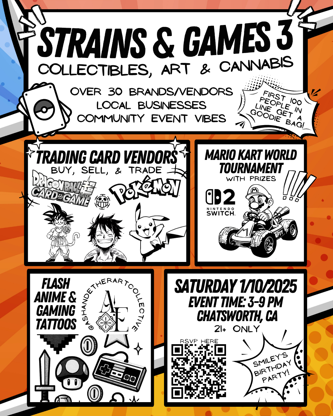 Strains & Games 3 returns Saturday, January 17th from 3–9 PM at The Carrus House in Chatsworth! Explore 30+ vendors featuring collectibles, art, cannabis, and munchies. Compete in the Mario Kart World Tournament on the Nintendo Switch 2, enjoy the game room, and discover a hidden speakeasy with a pool table and cannabis cocktail bar by LiquiDabs. Free RSVPs are limited—grab yours now!